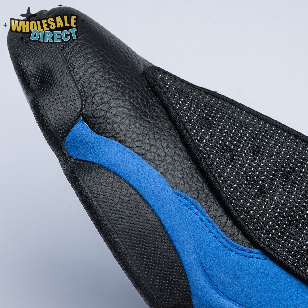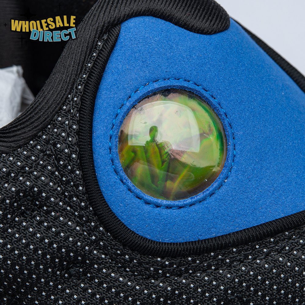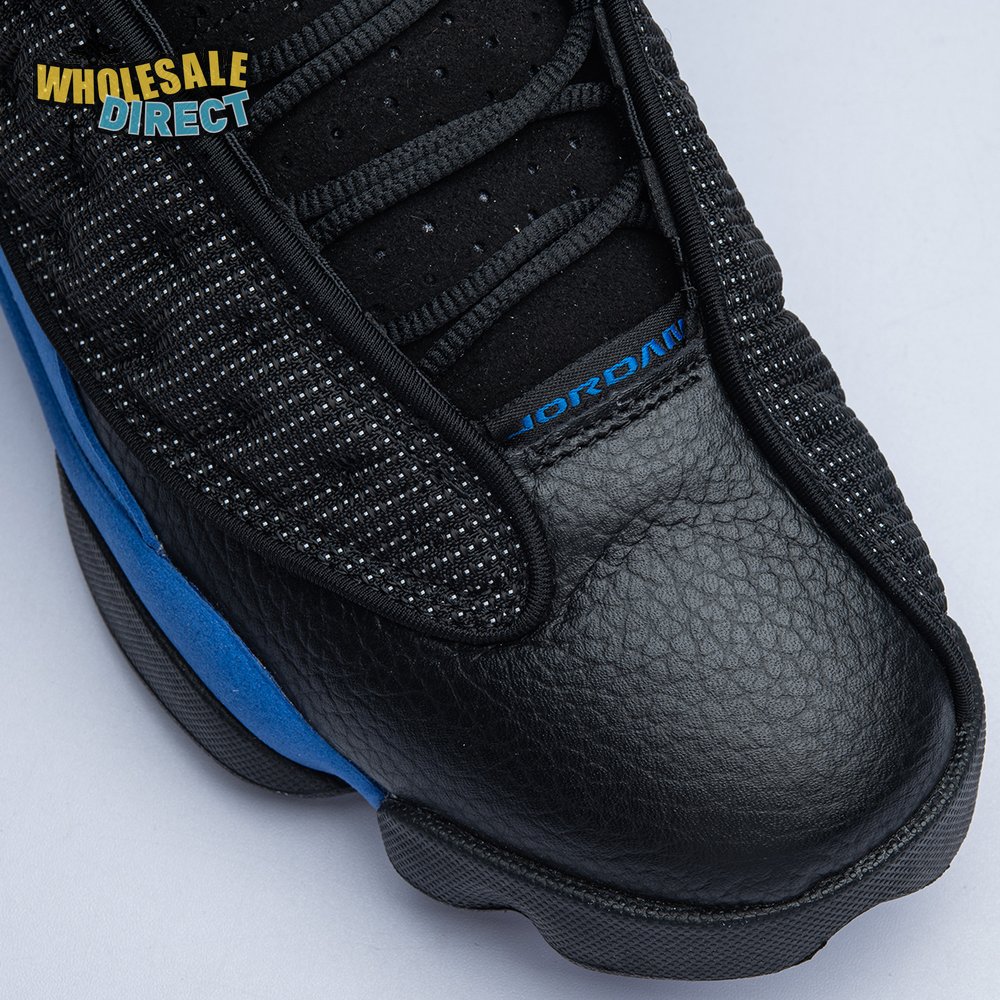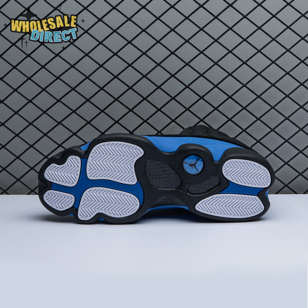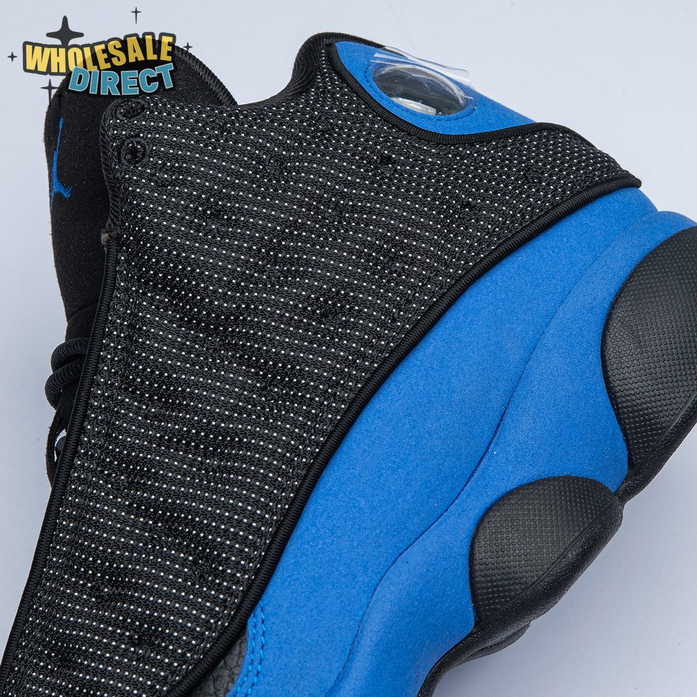 The Air Jordan 13 Retro "Black Royal" features a two-tone design reminiscent of Quentin Richardson"s Orlando Magic PE from 2012. The upper combines black tumbled leather, royal blue suede and reflective mesh overlays. Branding elements include the signature holographic eye and a blue Jumpman logo embroidered atop the tongue. The distinctive cat"s paw outsole is equipped with herringbone rubber for grippy traction underfoot.