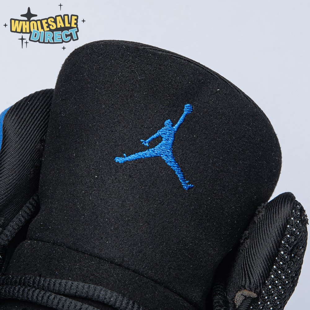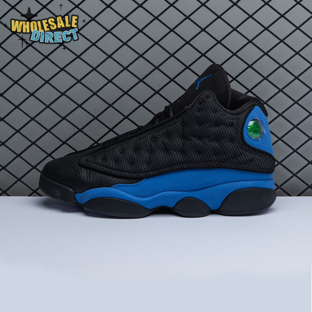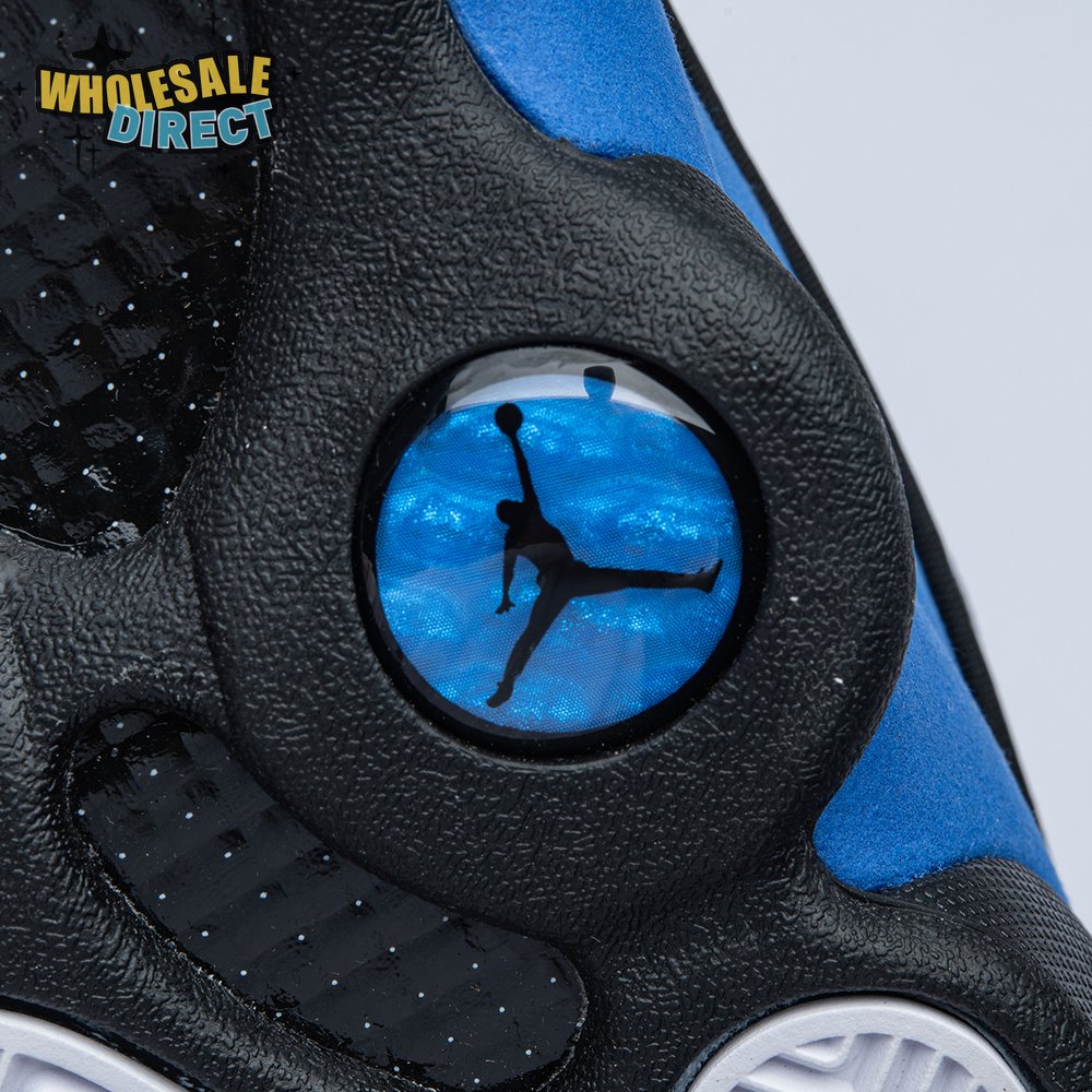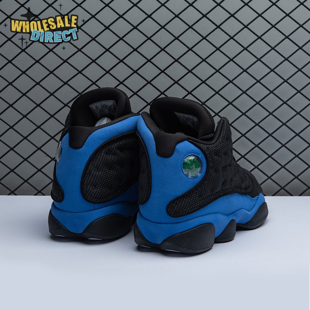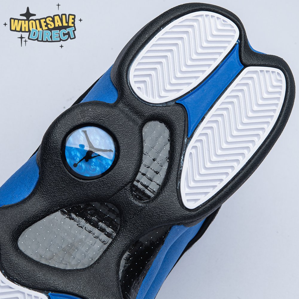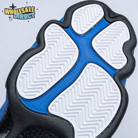The Air Jordan 13 Retro "Black Royal" features a two-tone design reminiscent of Quentin Richardson"s Orlando Magic PE from 2012. The upper combines black tumbled leather, royal blue suede and reflective mesh overlays. Branding elements include the signature holographic eye and a blue Jumpman logo embroidered atop the tongue. The distinctive cat"s paw outsole is equipped with herringbone rubber for grippy traction underfoot.