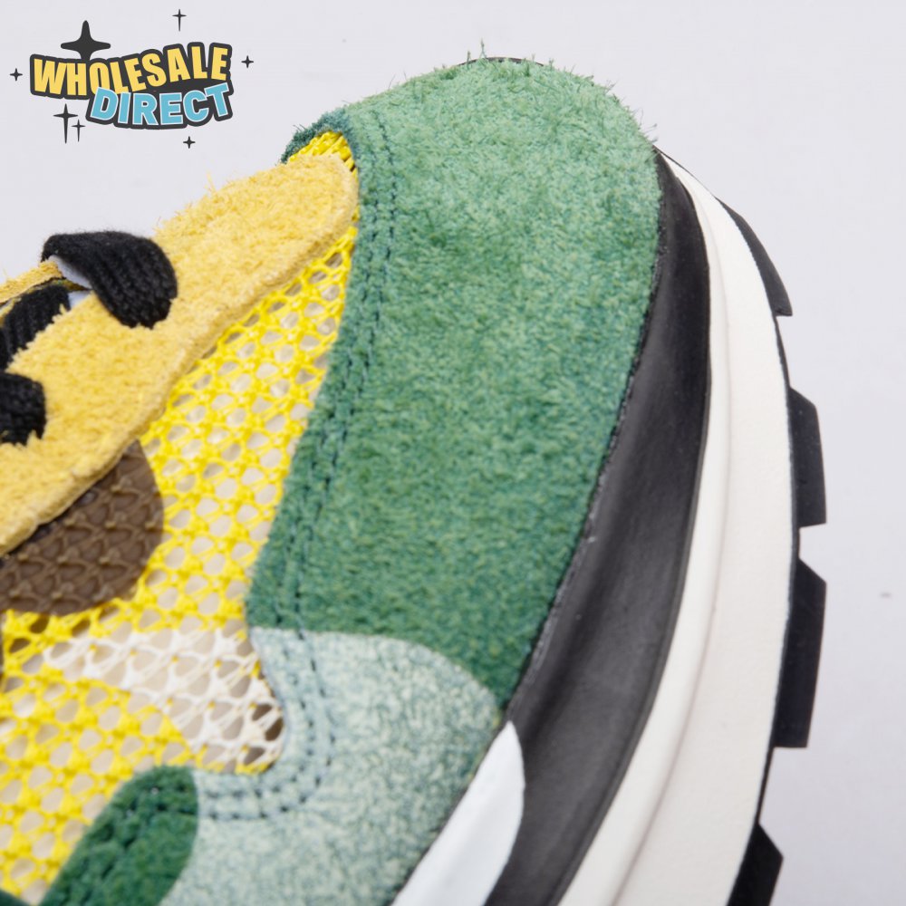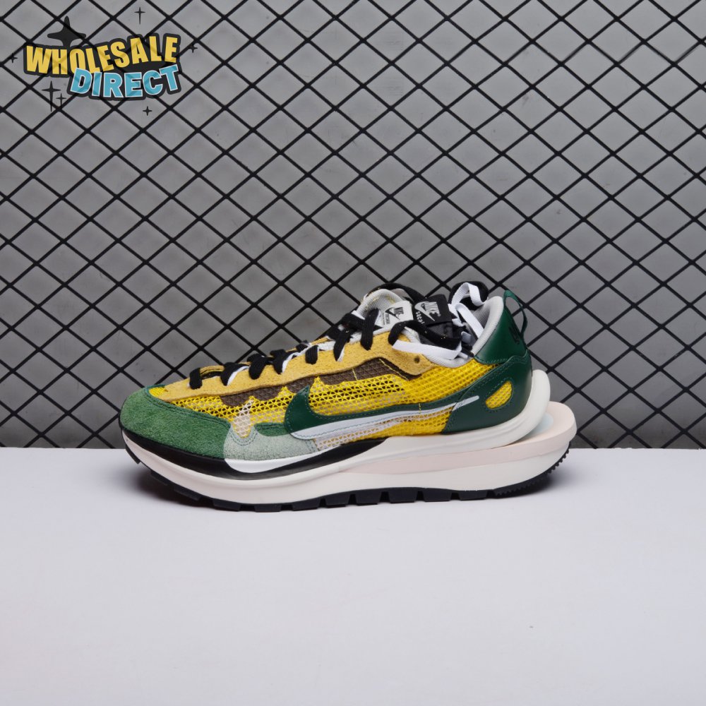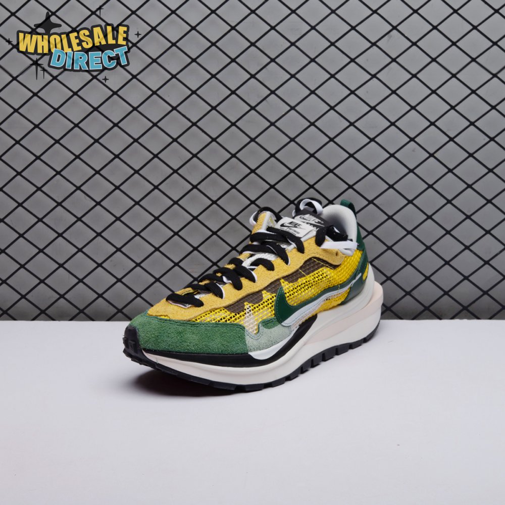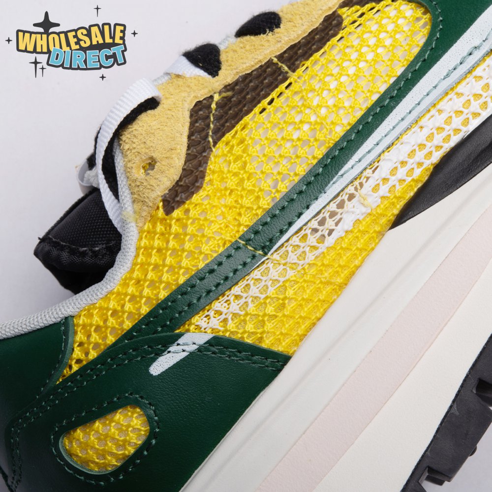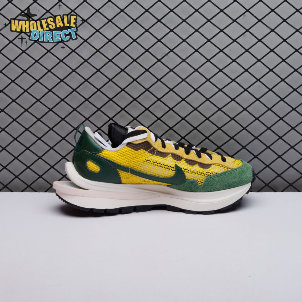 Made in partnership with the progressive Japanese fashion label, the Sacai x Nike VaporWaffle "Tour Yellow" picks up from where the brands" 2019 LDV Waffle collaboration left off. Like its predecessor, this pair doubles up on the tongue, laces and Swoosh branding. A breathable yellow mesh build, fortified with teal overlays in leather and suede, rides on a stacked midsole with split construction at the heel. Nike"s signature waffle outsole delivers grippy traction.