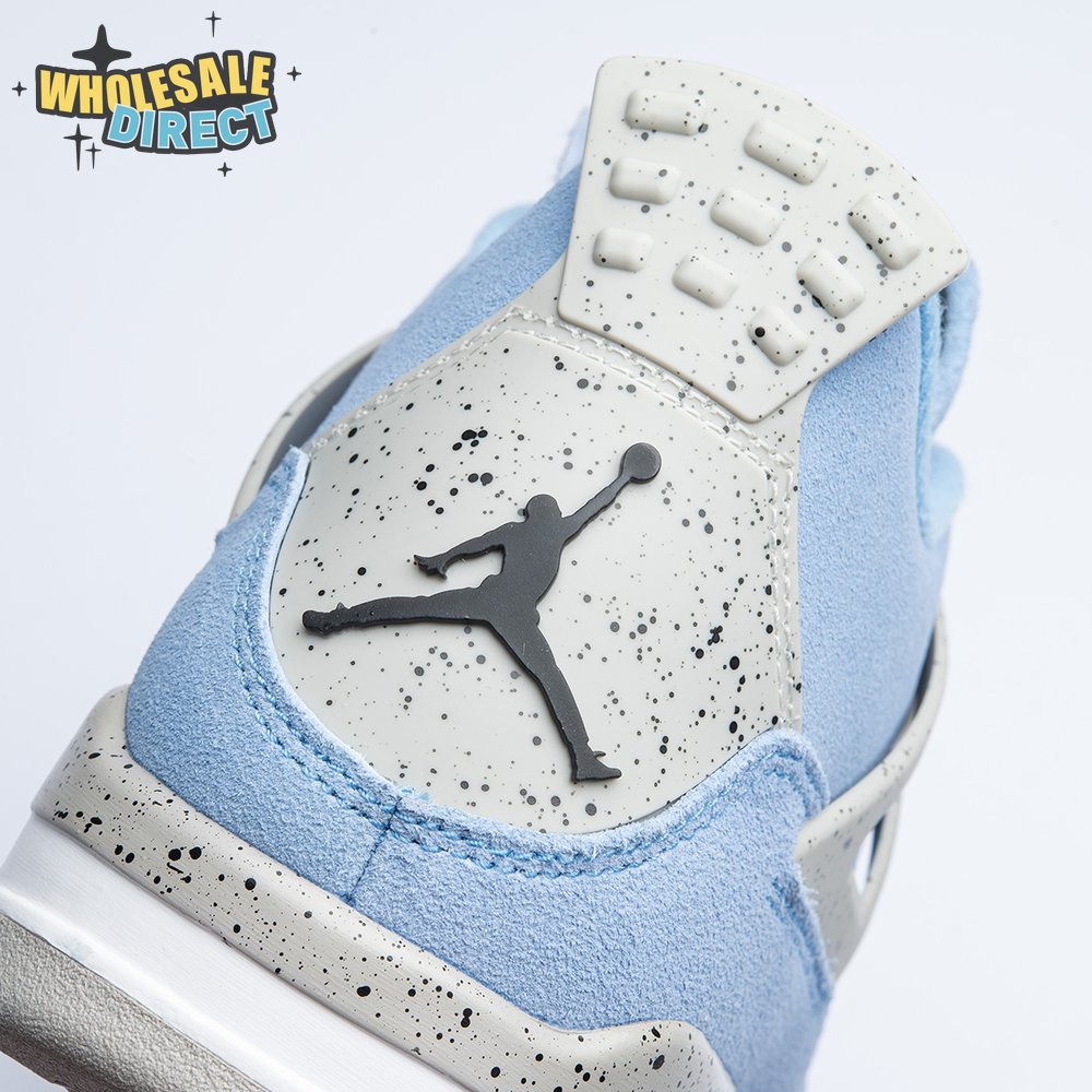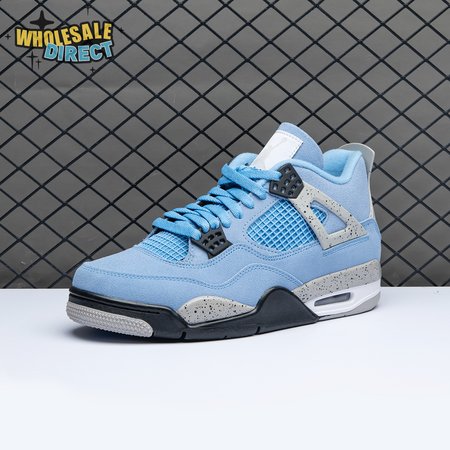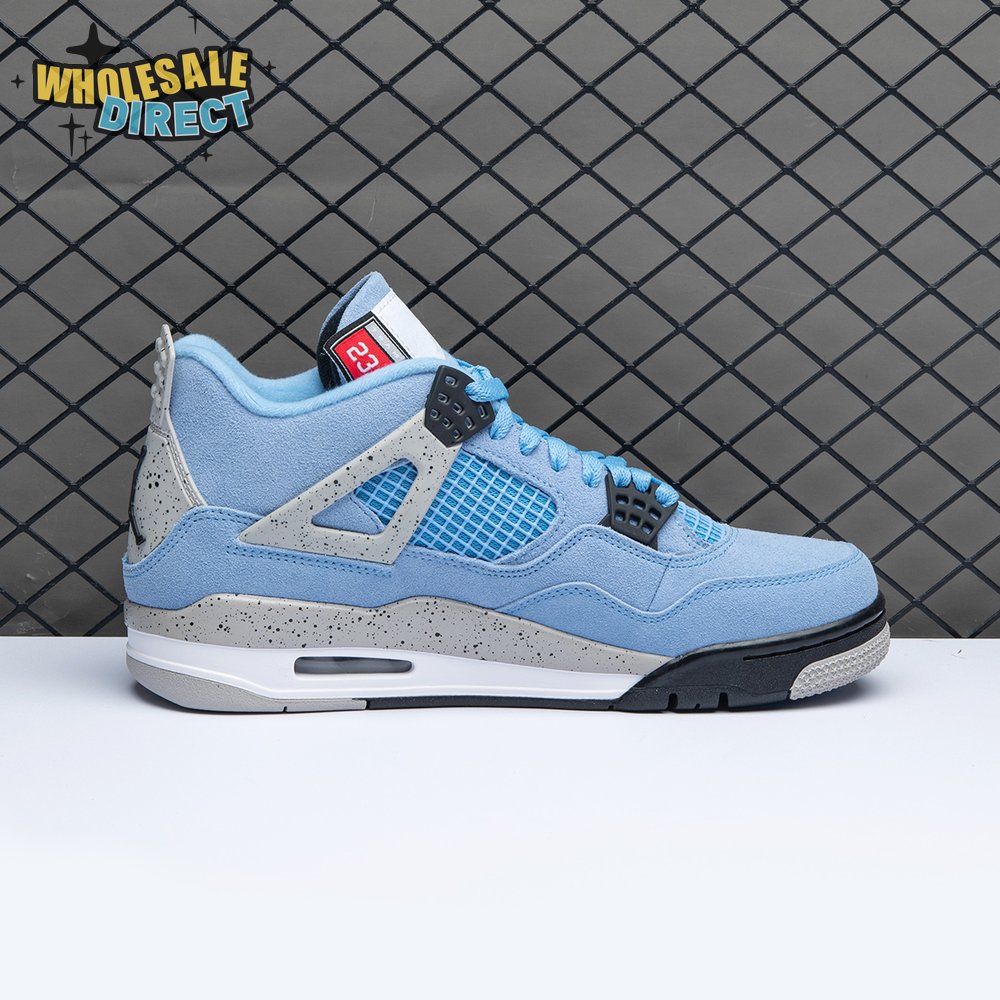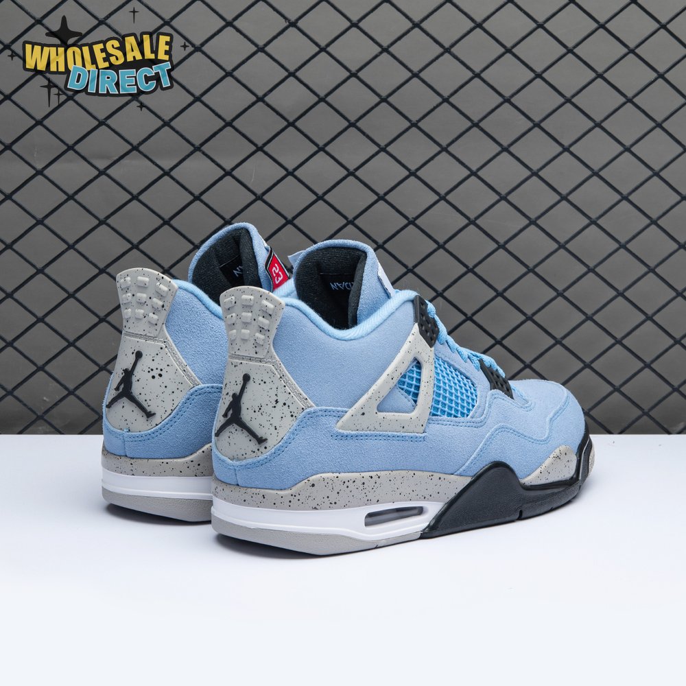 The Air Jordan 4 Retro "University Blue" updates the classic silhouette with a suede upper in a familiar hue inspired by Michael Jordan"s UNC alma mater. The bright blue palette is contrasted by a speckled grey finish on the sneaker"s supportive wings and back heel, featuring a raised Jumpman icon in black. Secondary Jumpman branding adorns the woven tongue tag, designed to mimic a jock tag that typically appears on the bottom hem of Jordan jerseys.