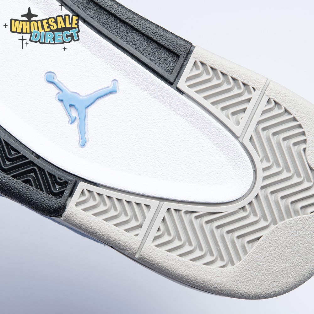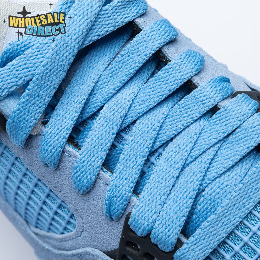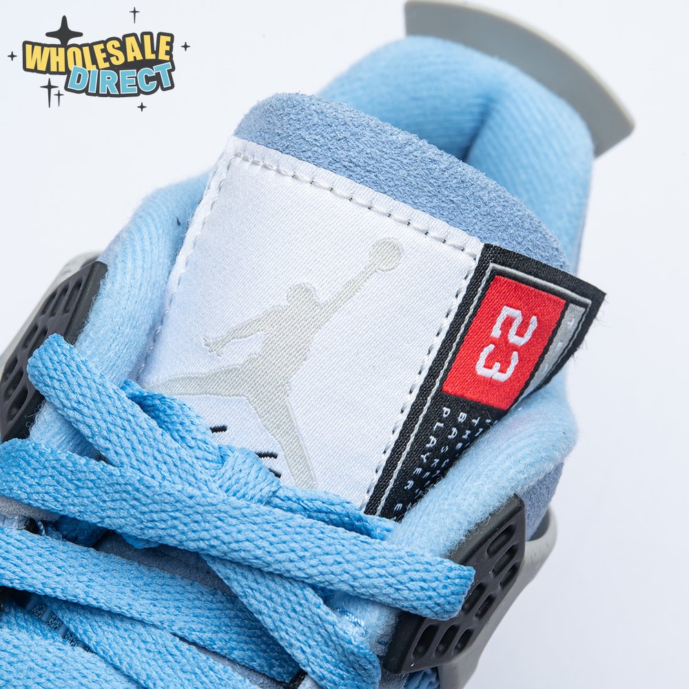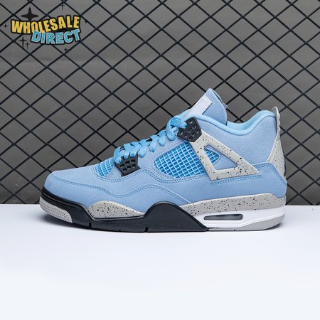 The Air Jordan 4 Retro "University Blue" updates the classic silhouette with a suede upper in a familiar hue inspired by Michael Jordan"s UNC alma mater. The bright blue palette is contrasted by a speckled grey finish on the sneaker"s supportive wings and back heel, featuring a raised Jumpman icon in black. Secondary Jumpman branding adorns the woven tongue tag, designed to mimic a jock tag that typically appears on the bottom hem of Jordan jerseys.