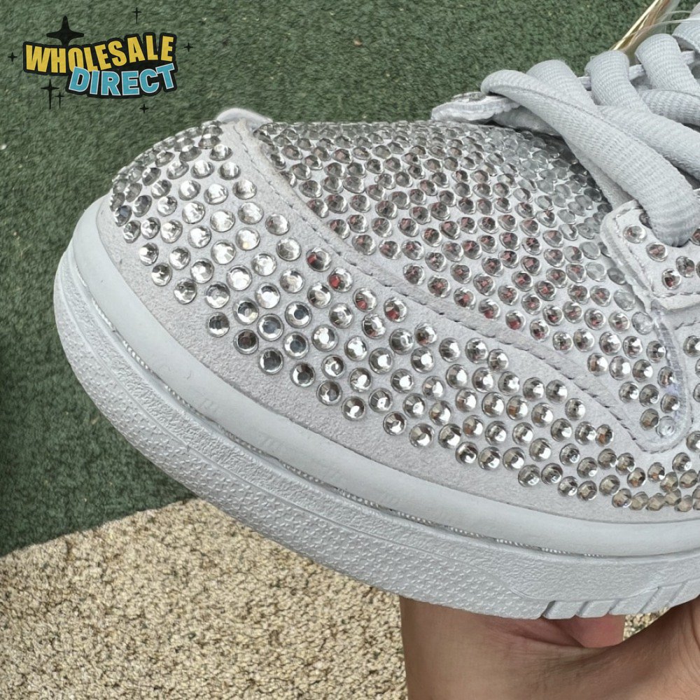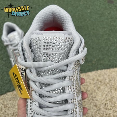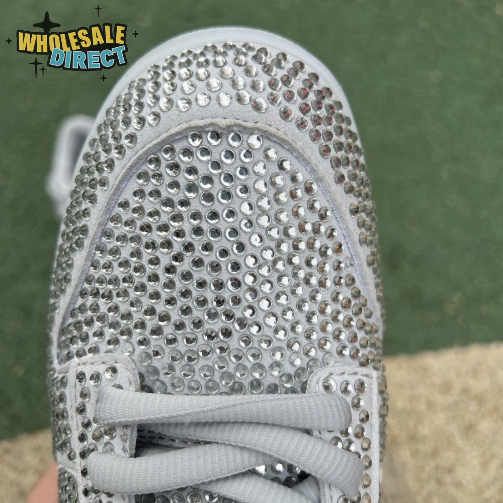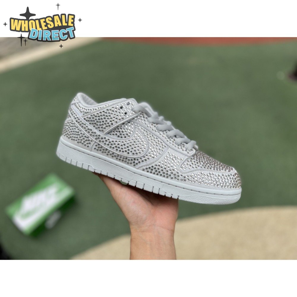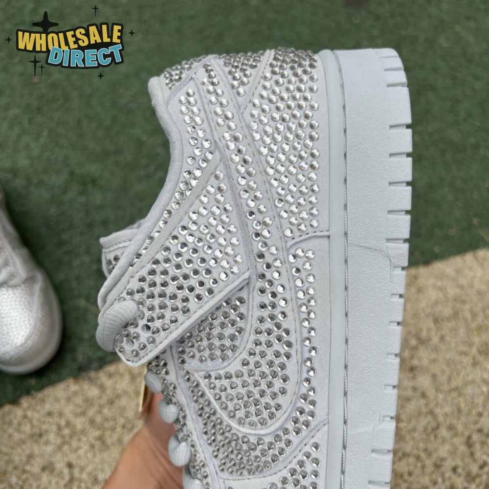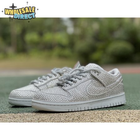 Designed in partnership with the LA-based streetwear brand, the Cactus Plant Flea Market x Swarovski x Nike Dunk Low "Pure Platinum" delivers an opulent take on the classic silhouette. Every inch of the suede upper is entirely covered in Swarovski crystals, including the detachable double lace flaps, heavily padded tongue and oversized Swoosh, the latter borrowed from CPFM"s previous Nike Blazer collaboration from 2019.