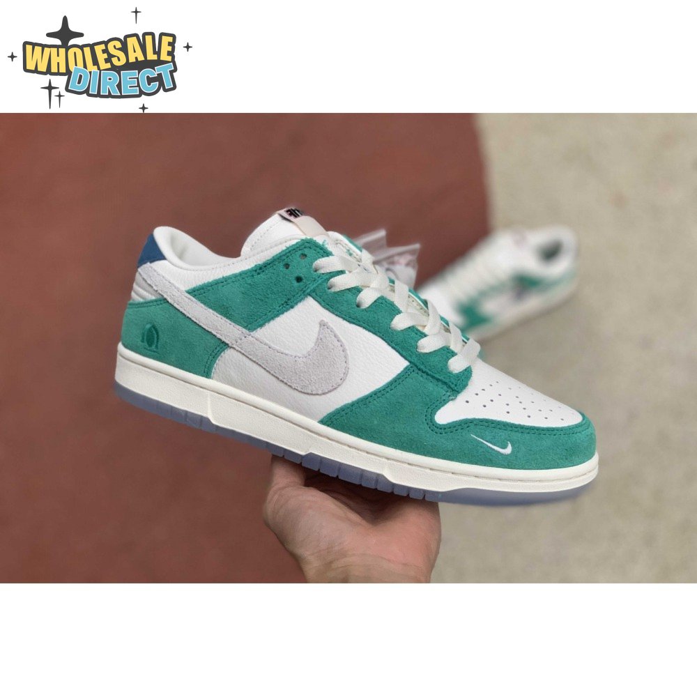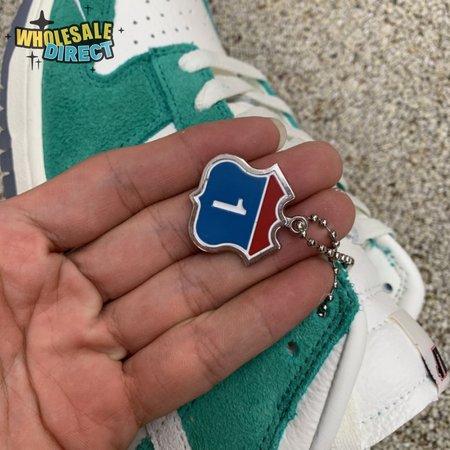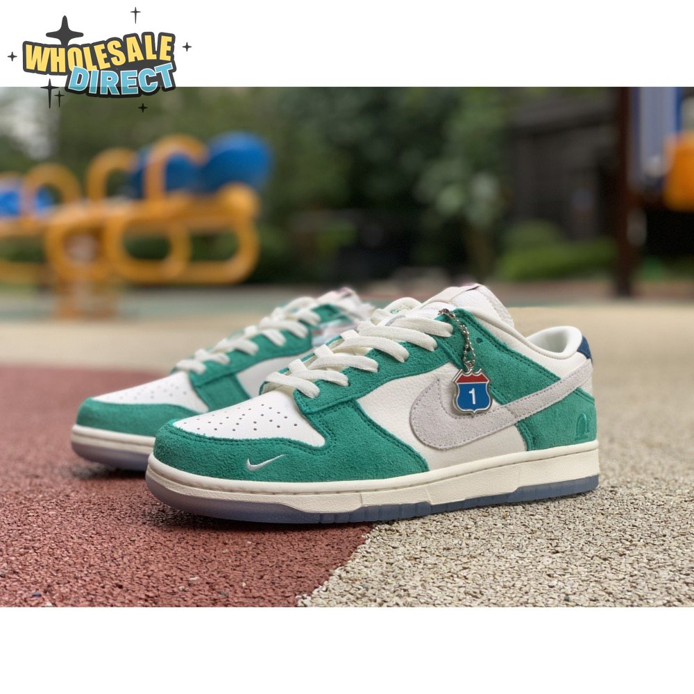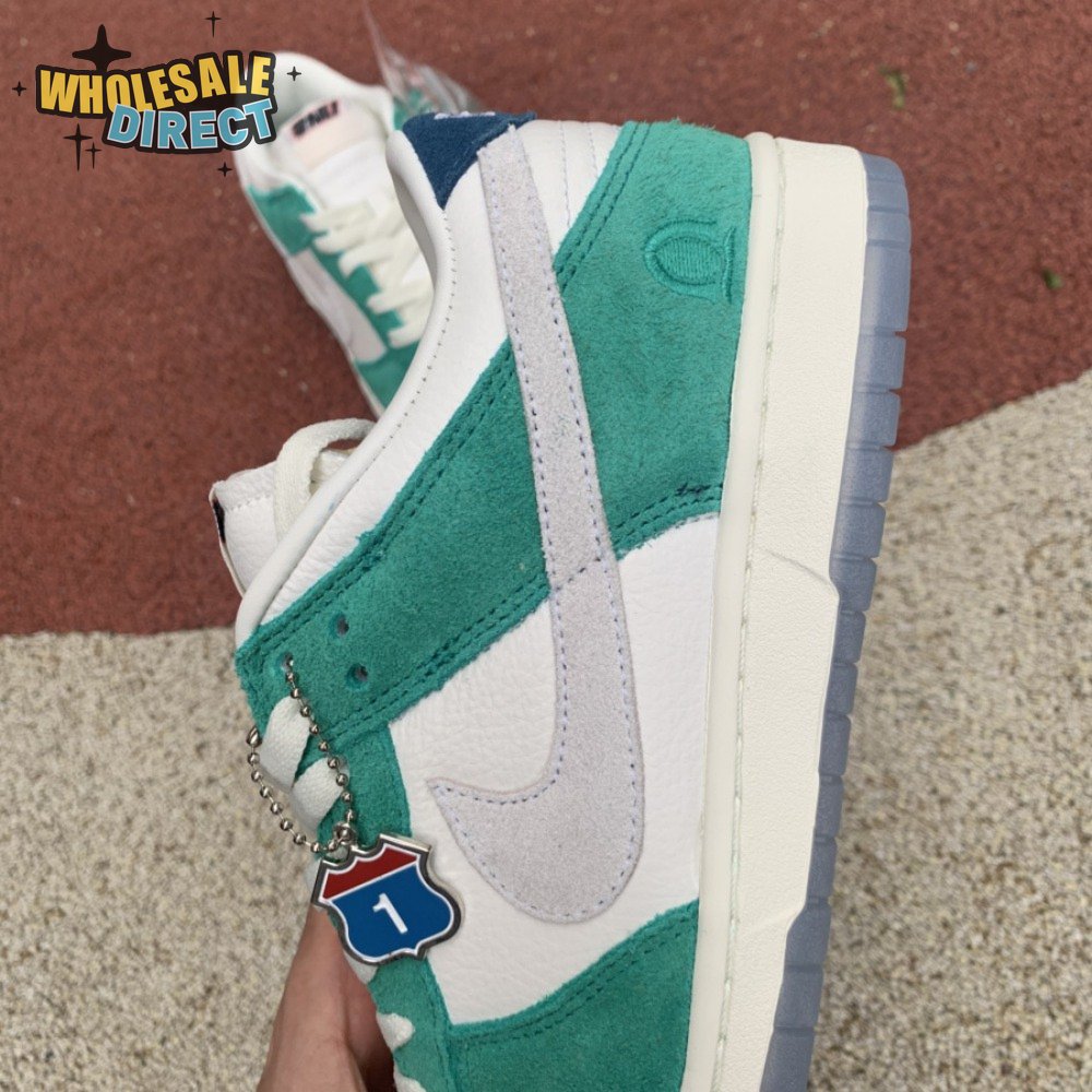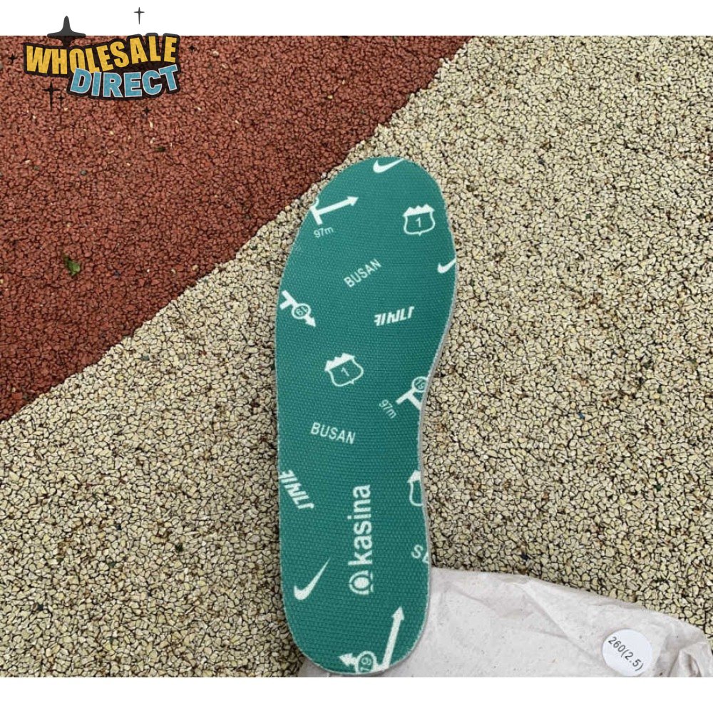 Made in collaboration with the Korean retailer, the Kasina x Nike Dunk Low "Road Sign" features colors inspired by the signage that lines the major highway connecting Busan and Seoul. The upper combines off-white leather with Neptune Green suede overlays and a grey suede Swoosh. Navy blue heel tabs replace Nike branding with "Busan" and "Seoul" on the left and right shoe. Additional details include Kasina"s logo on the lateral heel and the retailer"s name printed in Korean lettering on the tongue tag.