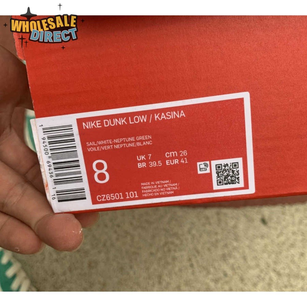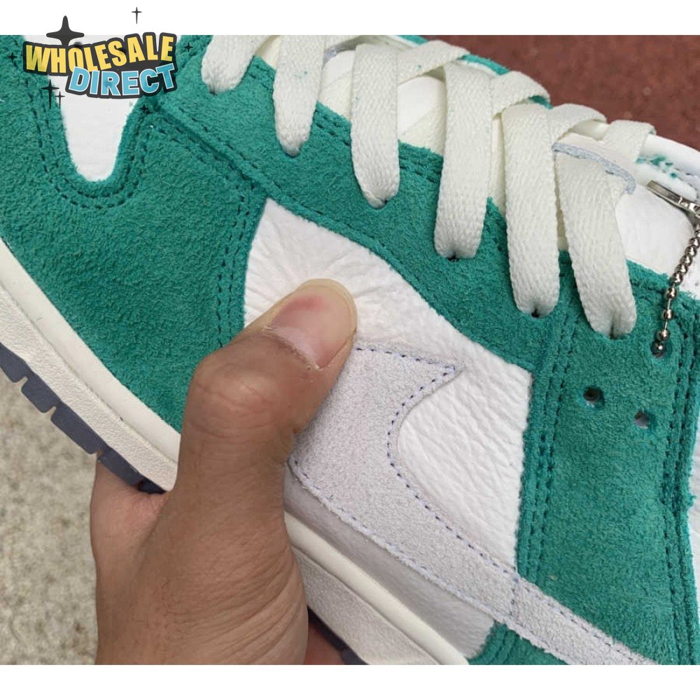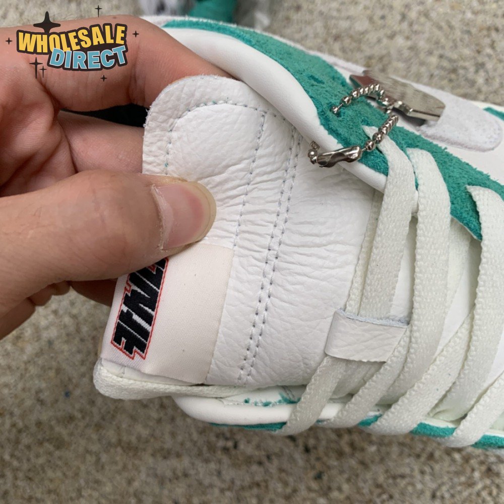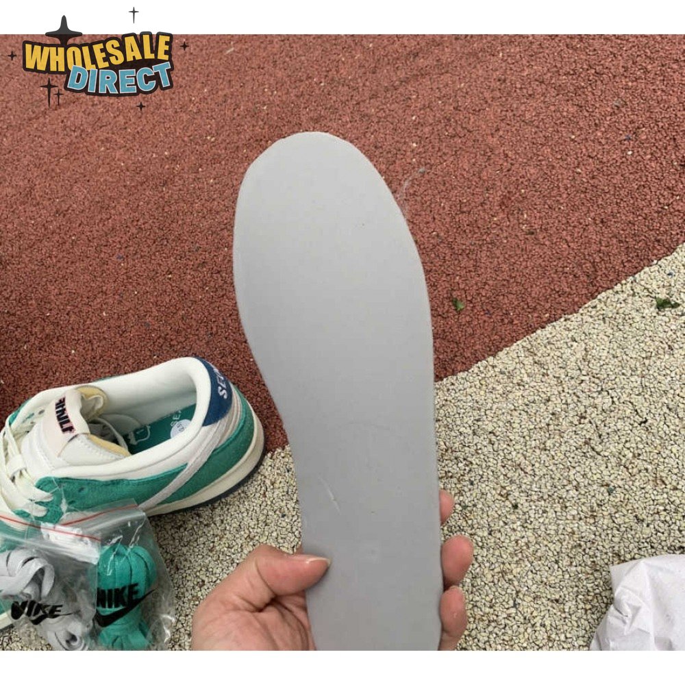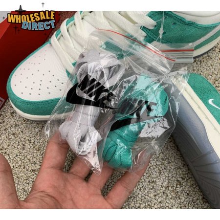 Made in collaboration with the Korean retailer, the Kasina x Nike Dunk Low "Road Sign" features colors inspired by the signage that lines the major highway connecting Busan and Seoul. The upper combines off-white leather with Neptune Green suede overlays and a grey suede Swoosh. Navy blue heel tabs replace Nike branding with "Busan" and "Seoul" on the left and right shoe. Additional details include Kasina"s logo on the lateral heel and the retailer"s name printed in Korean lettering on the tongue tag.