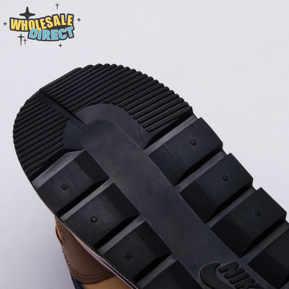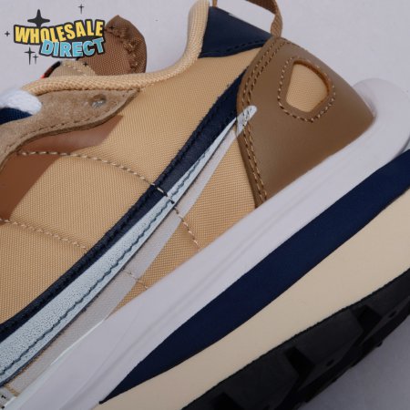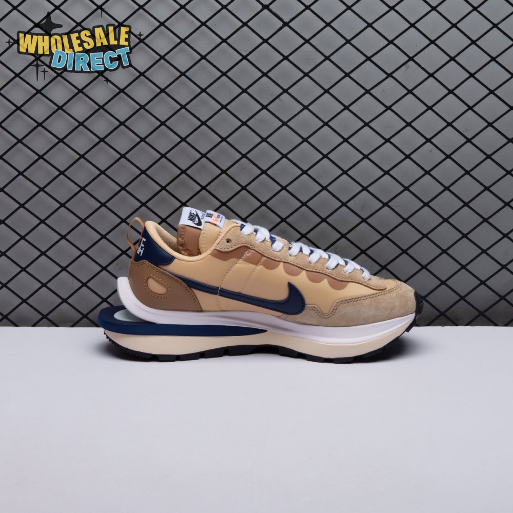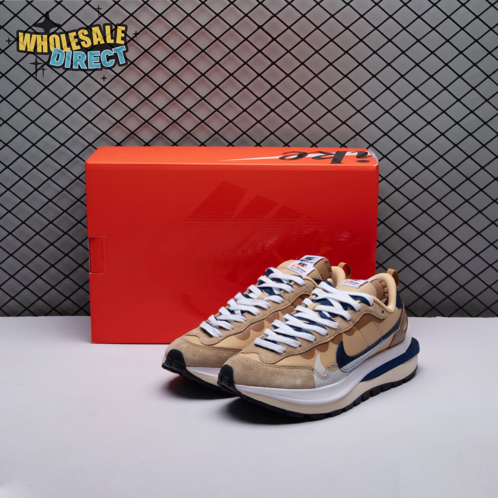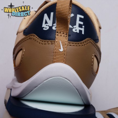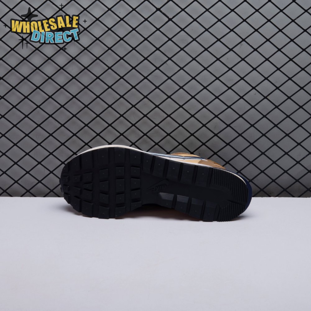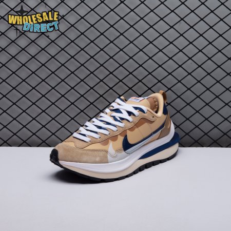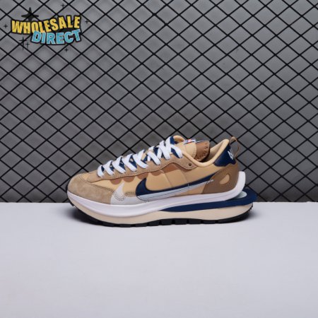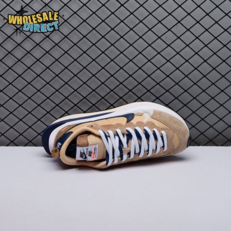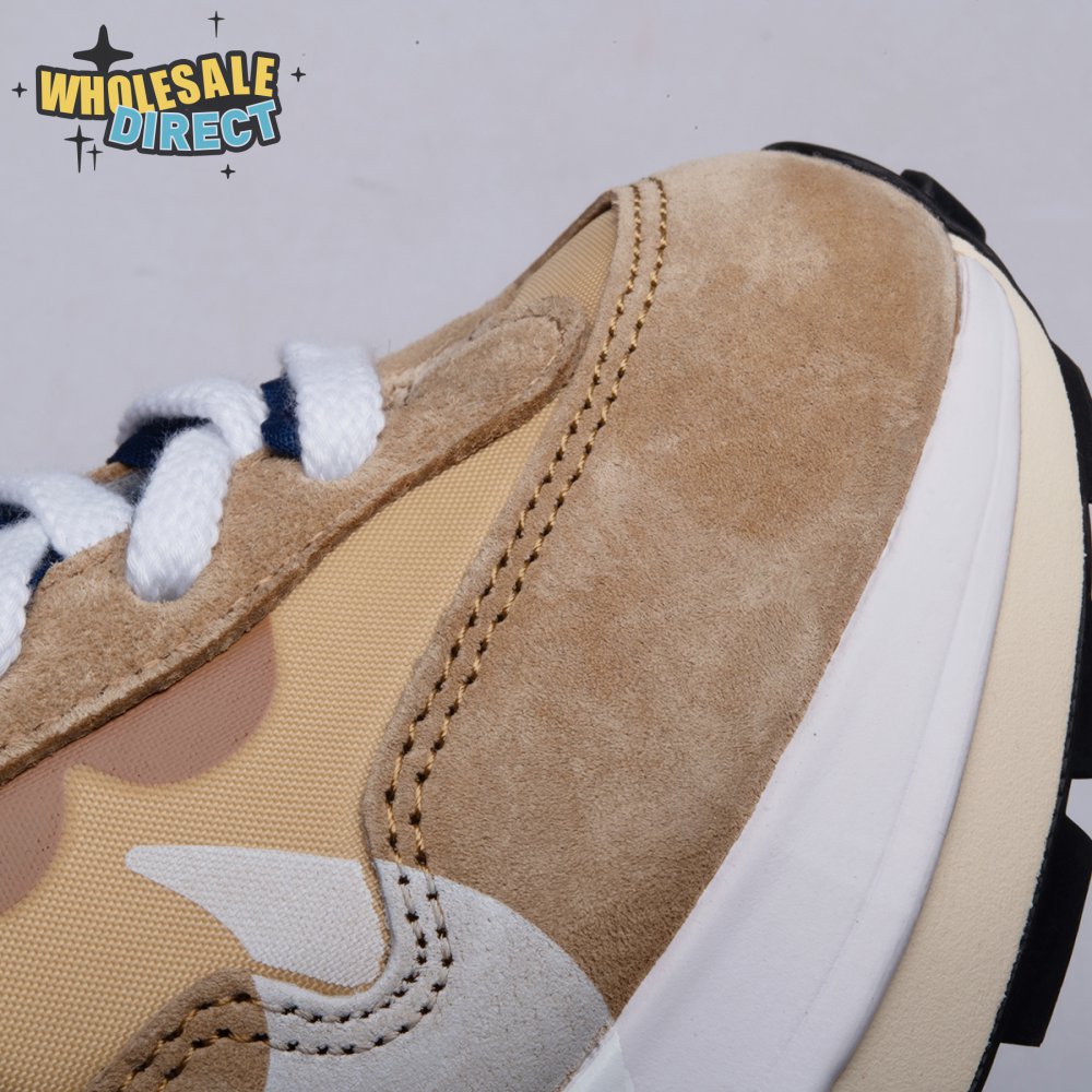 The sacai x Nike VaporWaffle "Sesame Blue Void" reunites the Swoosh with the Tokyo-based fashion label helmed by Chitose Abe. Blending elements from the modern Vaporfly and vintage Pegasus runner from 1983, the hybrid silhouette makes use of a khaki textile upper with tonal leather and suede overlays. A blue leather Swoosh is joined by a larger printed Swoosh in contrasting white. Tongues are similarly doubled up, each accented with a woven Nike tag. The sneaker rides on a dual-layered foam midsole, featuring split heel detailing and supported by a classic waffle tread outsole.
